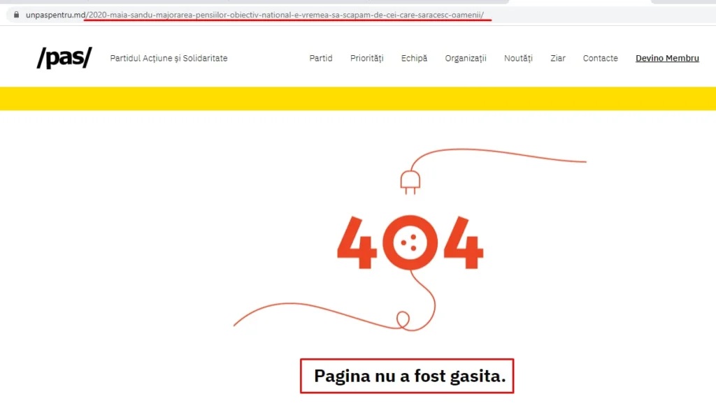 La o simplă încercare de a deschide articolul de pe site-ul unpaspentru.md, se afișează o eroare 404, însoțită de textul – „Pagina nu a fost găsită”.