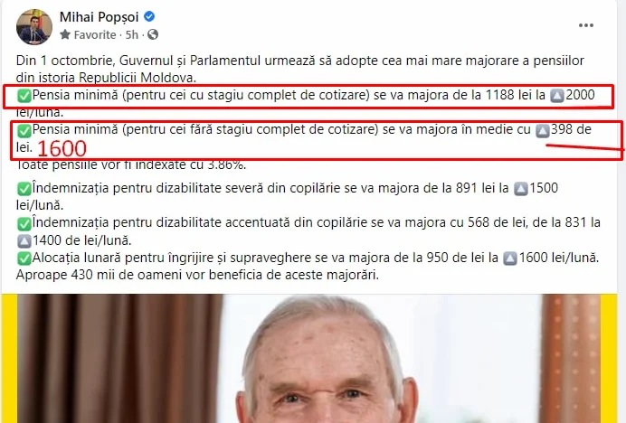 Ulterior, sau mai bine zis cu o oră mai târziu, deputatul Mihai Popșoi s-a răzgândit, a șters poza și a postat o poză similară, doar că deja cu alte cifre. Mai exact, pensia minimă de 2000 de lei pentru 183.000 de bătrâni din țară, s-a transformat în pensie de 2000 de lei pentru 308.000 pensionari.
