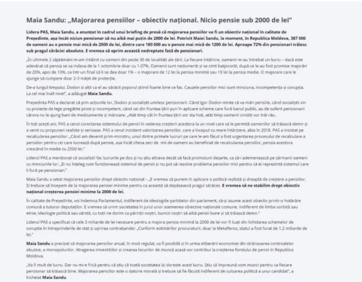Mai exact, în articolul ce a fost încărcat pe 15 septembrie, anul 2020, se menționa că prin cadrul unui briefing de presă, candidatul PAS din acea perioadă la funcția de Președinte al Republicii Moldova, Maia Sandu, anunța că majorarea pensiilor devine un obiectiv național, „așa încât nici un pensionar să nu aibă mai puțin de 2000 de lei”.
