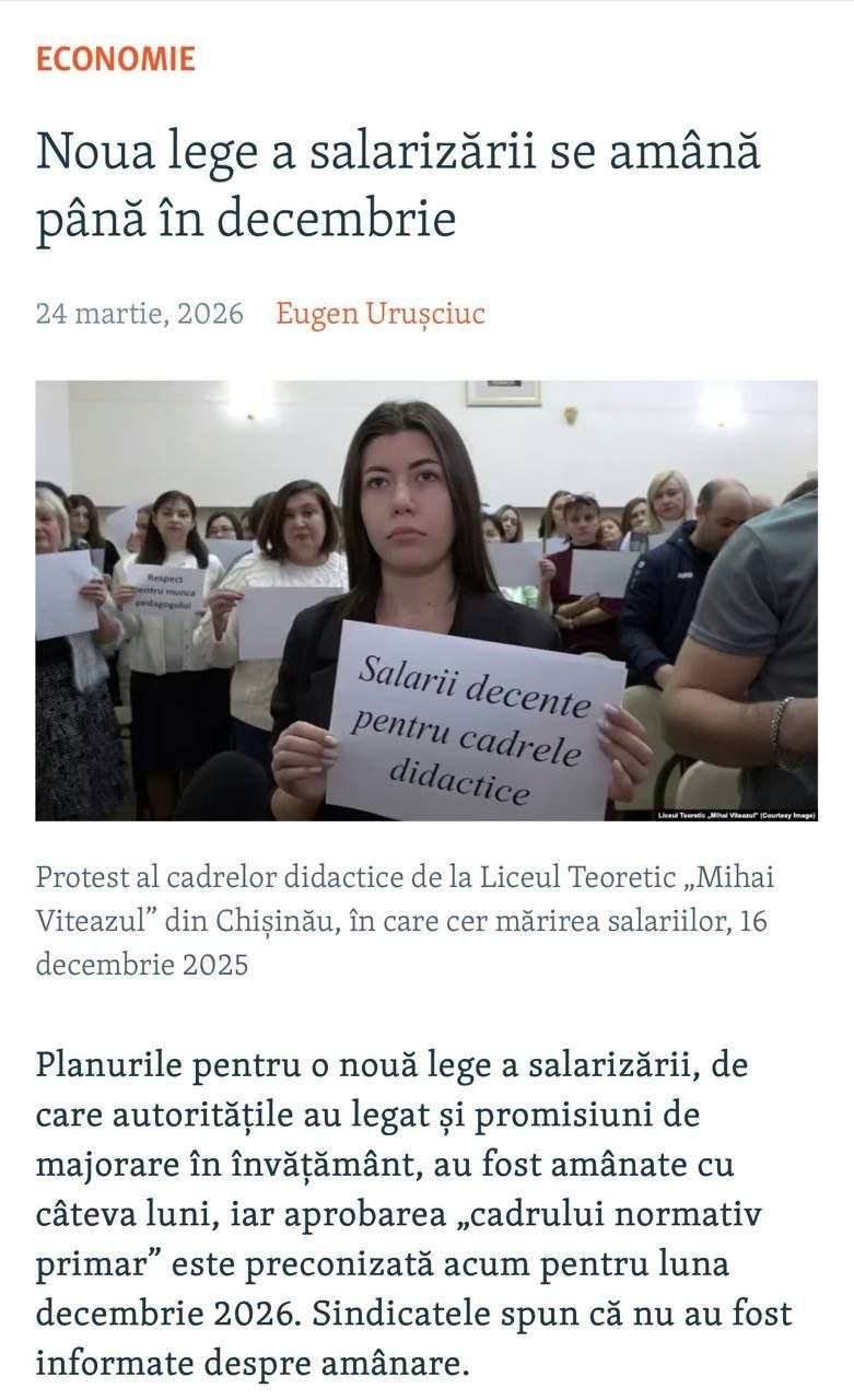 În Republica Moldova, adoptarea noii legi a salarizării — document de care autoritățile au legat promisiuni de majorări pentru sectorul bugetar — a fost amânată pentru luna decembrie 2026. Inițial, aprobarea era planificată pentru septembrie.