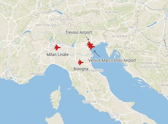 Pentru celelalte zboruri comerciale, în aeroporturile din Veneția, Treviso și Bologna a fost stabilită o limită de maximum 2000 de litri de combustibil per aeronavă.