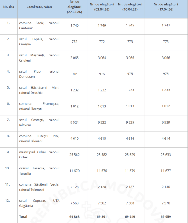 Центральная избирательная комиссия сообщает, что на новых местных выборах, запланированных на 17 мая 2026 года в 12 населенных пунктах страны, зарегистрировано 69 959 граждан с правом голоса.